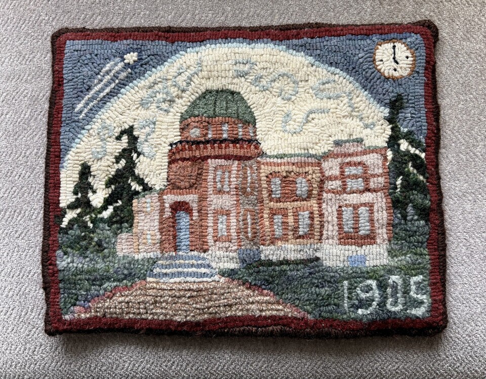 The rug hooking group took their name from the building where they first held regular meetings. It took an estimated 250+ hours of effort by 24 volunteers to plan and complete the rug in 2020. Nora Lee organized its design and construction, and Pat Bonn did most of the design. The story of the making of this rug was published in Rug Hooking Magazine in 2024.